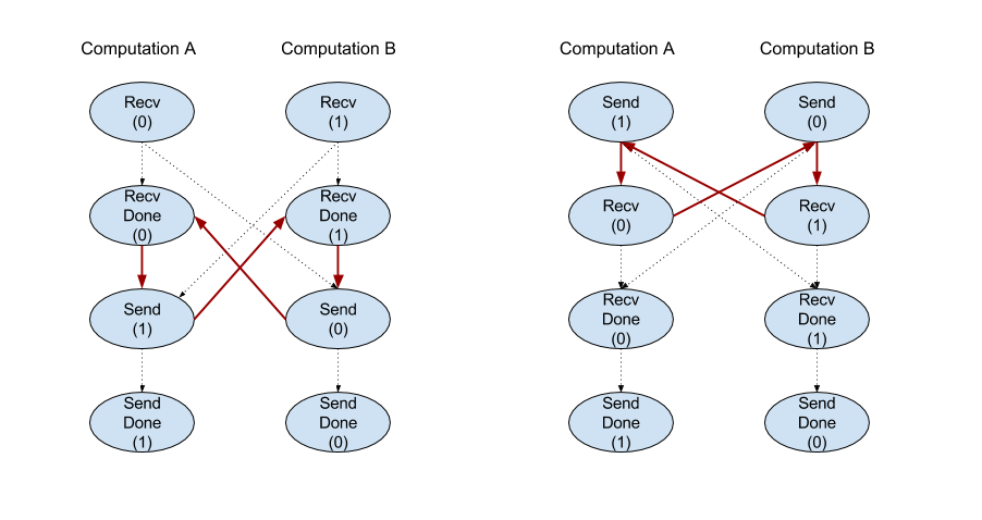 AllReduce 결과를 계산하려면 각 복제본의 입력이 하나씩 있어야 하므로 한 복제본이 다른 복제본보다 AllReduce 노드를 더 많이 실행하면 전자의 복제본이 영원히 대기합니다. 복제본이 모두 동일한 프로그램을 실행하므로 이러한 상황이 발생할 가능성은 크지 않지만, while 루프의 조건이 infeed의 데이터에 따라 달라지고 infeed의 데이터로 인해 한 복제본에서 다른 복제본보다 while 루프가 더 많이 반복되는 경우 가능합니다.